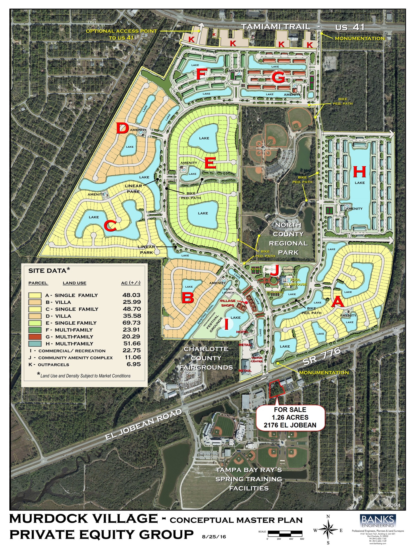 - Proposed development of Murdock Village shows the main entrance road being directly across El Jobean Road from this site. The future potential is huge! Rental income from the old house on the property and the two sided billboard allows this site to be a land speculation investment that cash flows.